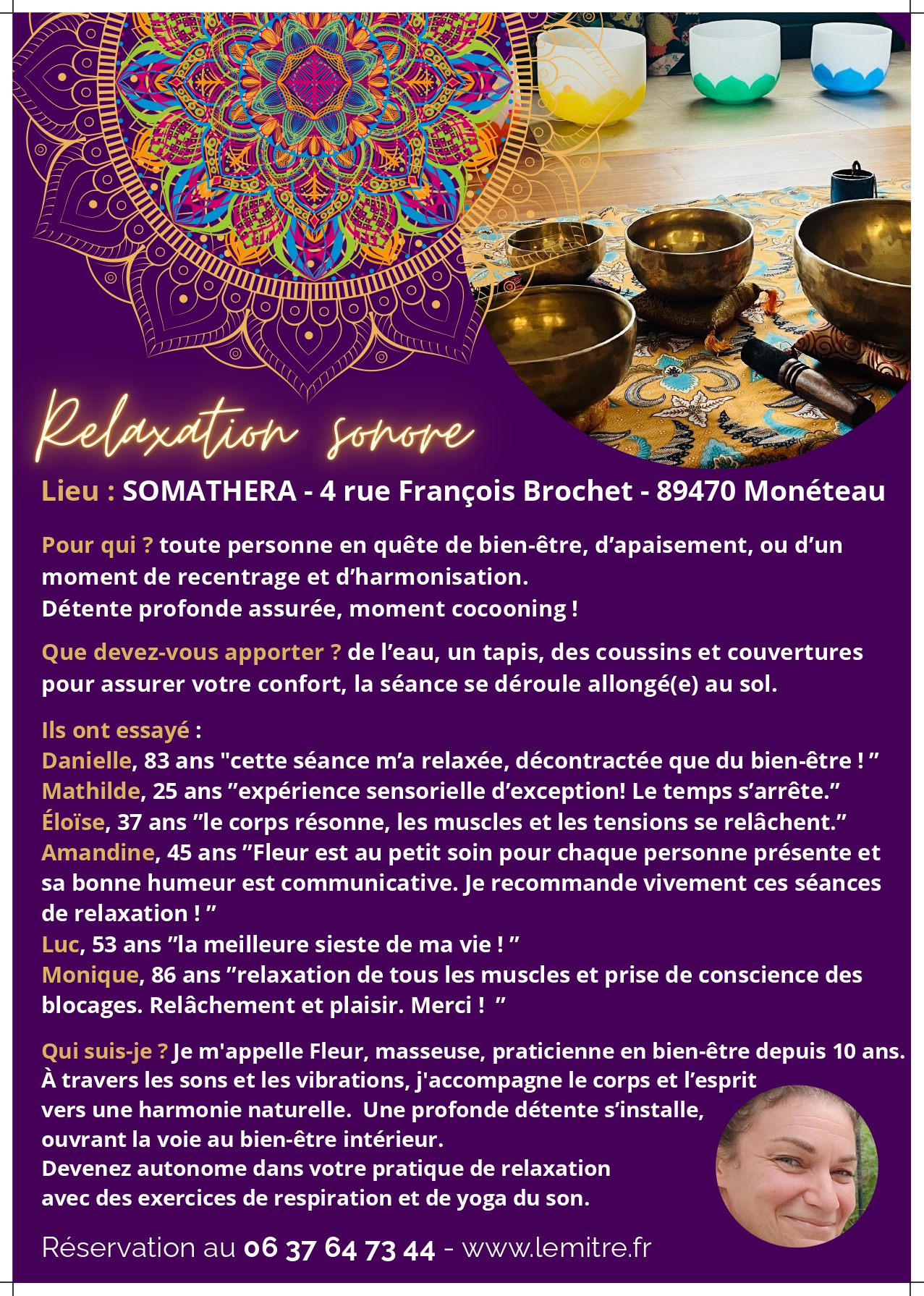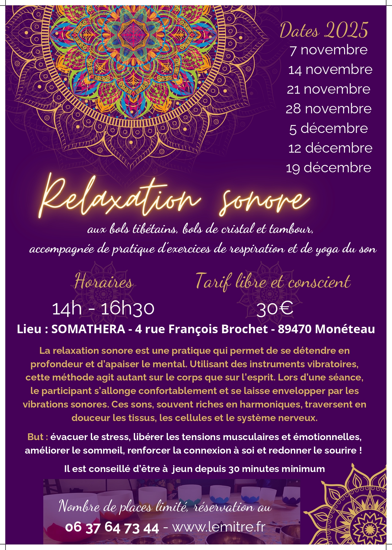 Tous les ateliers intègrent une séance de relaxation dirigée, conçue pour favoriser le lâcher-prise, l’apaisement émotionnel et mental, ainsi que la reconnexion à soi. Cette pratique permet d’améliorer la qualité du sommeil, de réduire le stress, les tensions et les douleurs, tout en stimulant la circulation énergétique et sanguine.